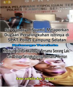 Lampung Selatan – Merasa kesucian rumah tangganya sudah ternodai akibat perselingkuhan yang dilakukan istrinya ,seorang suami bernama Sri Wandoyo (55) ,Warga Desa Muara Putih Dusun Tangkit Batu Kecamatan Natar Lampung Selatan melaporkan istrinya bernama Khoiriyah dan Seorang Laki – Laki bernama Herman Ke Polres Lampung Selatan yang diduga sejak lama telah menjalin hubungan spesial dengan istrinya.